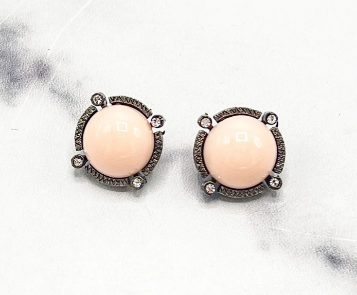 The Odelia Earrings feature a vintage glass jade or angel skin stone beautifully set at the center, surrounded by a textured setting that adds depth and character. Four small bezel-set crystals enhance their delicate elegance, creating a subtle sparkle that complements any look. Comfortable post backs make these earrings an effortless choice for everyday wear, while their timeless design offers a graceful touch to your jewelry collection. Perfect for those who appreciate handcrafted detail and understated sophistication.24K Gold Plate. Hematite Plate. Post Closure. Proudly Made in the U.S.A.