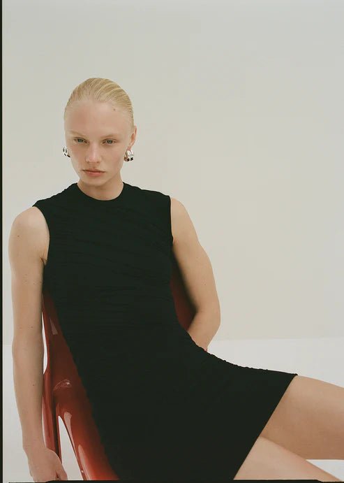 The Ester Twist Dress is a sleeveless silhouette with subtle ruching for a flattering fit. Cut from ultra-soft lightweight baby rib, it offers gentle stretch and pairs effortlessly with boots or layered pieces.