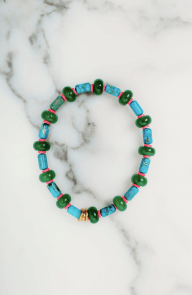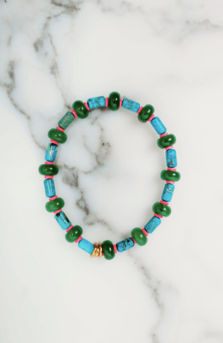 Slip on the Yara Bracelet for an instant pop of personality! This playful stretch design features a vibrant mix of glass jade and turquoise heishi beads, punctuated with fun pink vinyl spacers. Perfect for stacking or wearing solo, this carefree accessory adds a splash of color to any outfit.
