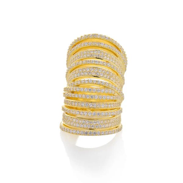 Sparkling bands of pave cubic zirconia arranged in an entwined pattern for a glamorous look.
