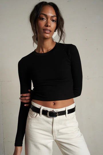 the sienna top is our luxe rib staple, now in a cropped long sleeve. fitted with stretch and just the right amount of structure, it’s designed to hit above the waist for a flattering silhouette that’s perfect with high-rise anything.