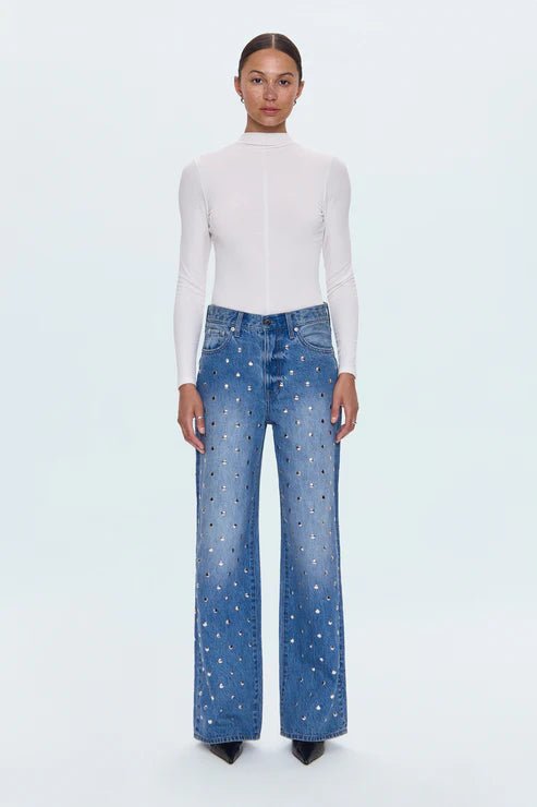 A relaxed silhouette, Hendrix features a high rise and full-length baggy leg that strikes the perfect balance between structure and slouch. Crafted from 100% cotton rigid denim, the Charmed wash showcases a medium blue tone adorned with hand-applied crystal embellishments for subtle sparkle and standout detail.