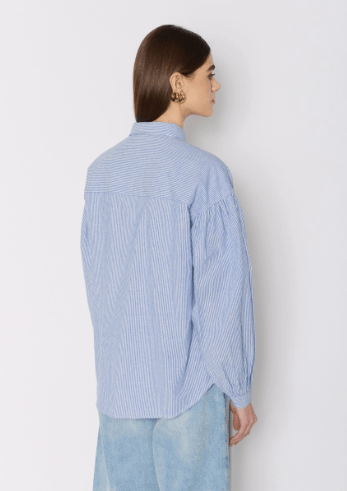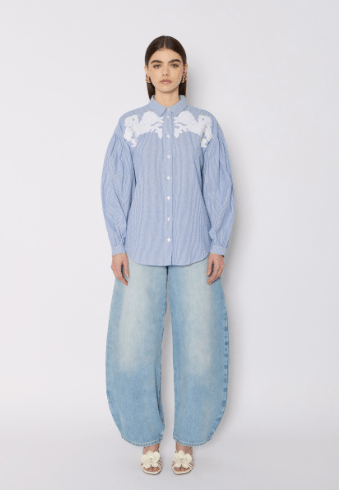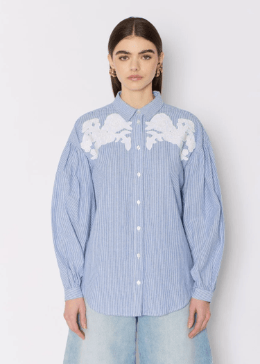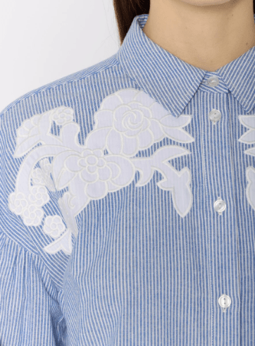 The CABINA shirt embodies refined elegance. This blue oversized shirt with light stripes is distinguished by its white embroidery at the chest, adding a touch of originality. The embroideries provide an elegant contrast with the flowing fabric. The long, puffed sleeves bring a voluminous dimension to this piece, while remaining light and fluid.