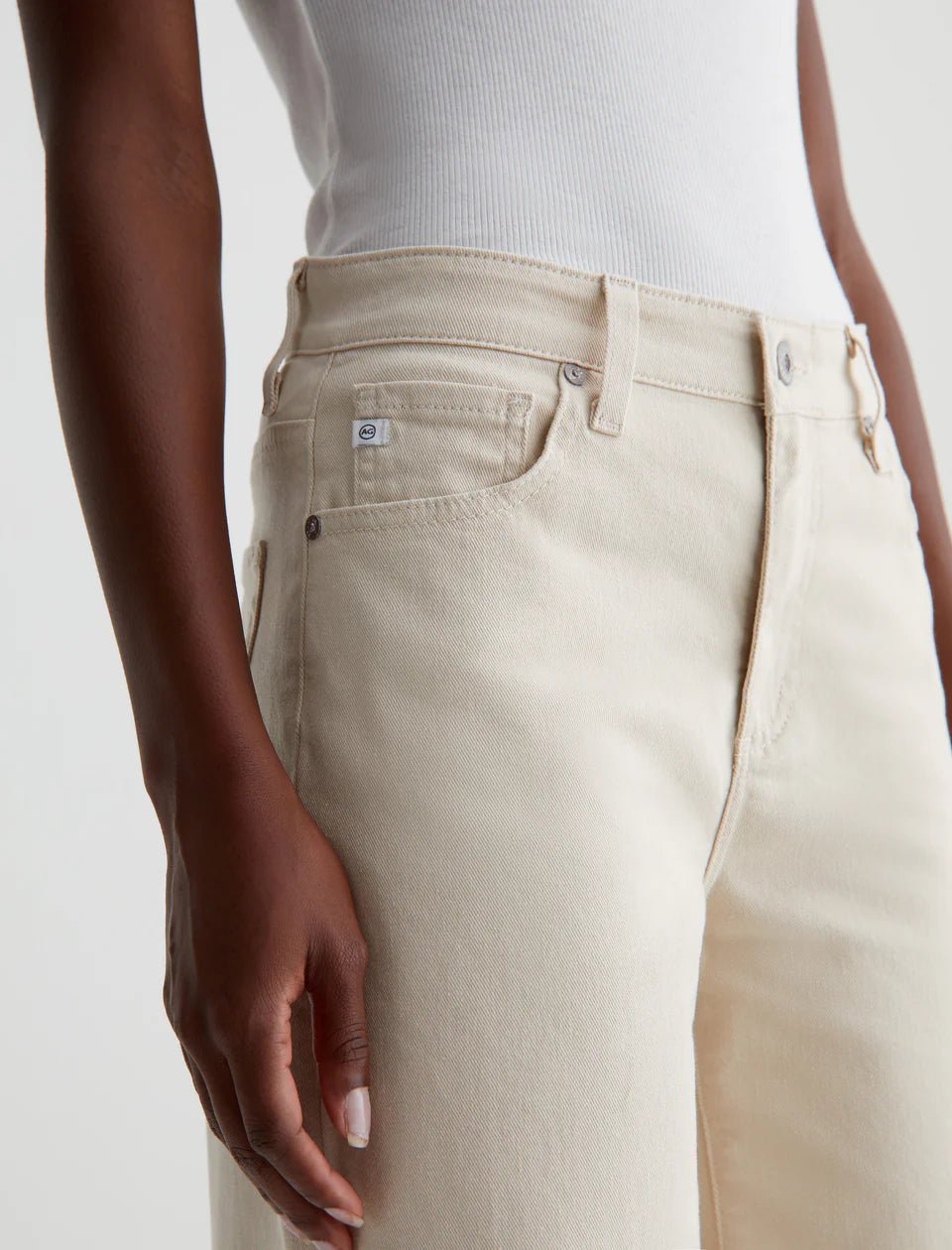 The Saige Wide Leg Crop is an off-white mid-rise jean with loose, cropped legs and raw hems. These women's wide-leg jeans come in our 8.7 oz. Hyper Soft Bull Denim featuring dual-elastic for supreme comfort and advanced recovery. AG Cloud Soft Denim™ fabrics feature special left-hand twill construction that allows the yarns to gently relax and untwist for a luxe, supple feel. It's designed to get even softer the more you wear it.