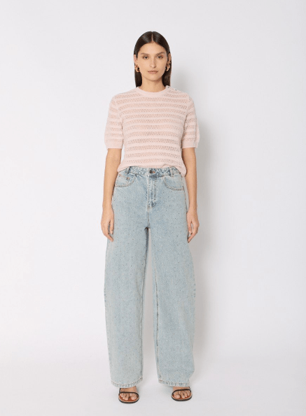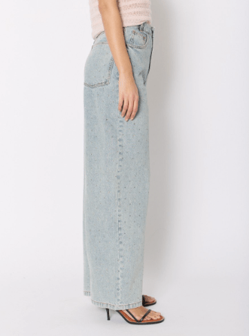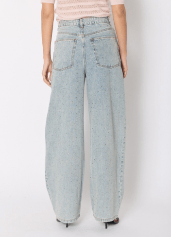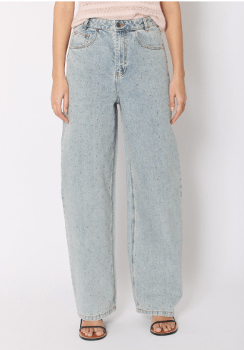 An essential for those who dare to shine and assert their style, the ATLANTASTRAS jeans are a strong piece of the collection. Its wide leg cut ensures a structured and fashionable fit. These mid-rise jeans stand out with their set of delicately applied silver rhinestones, which catch the light and add a glamorous touch to a slender silhouette. Combined with a minimalist top for a chic contrast or with a strong piece for a bold look, it becomes the flagship element of any outfit.