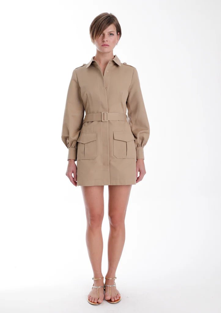 This long sleeve mini dress blends tailored structure with effortless sophistication. Featuring a clean collared neckline, concealed button placket, and a matching belt that defines the waist, it’s finished with statement flap pockets and subtly puffed sleeves for added dimension. This dress delivers a sleek, confident silhouette—perfect for days that call for chic, understated style