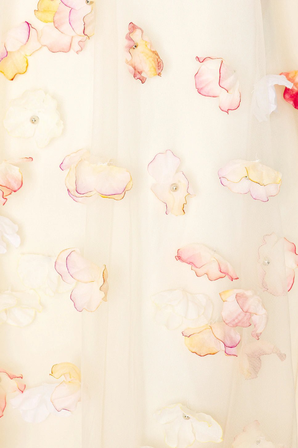 With a relaxed and flowy fit, the baby-doll mini dress effortlessly drapes over the body, offering comfort and elegance. The combination of the delicate 3D floral tulle fabrication and the airy silhouette creates a light and romantic feel, ideal for spring and summer occasions.