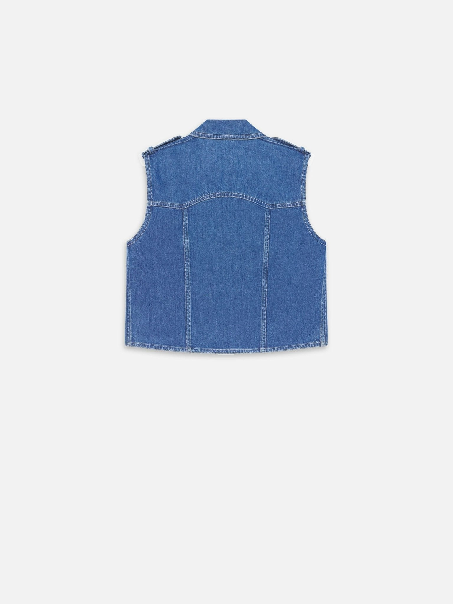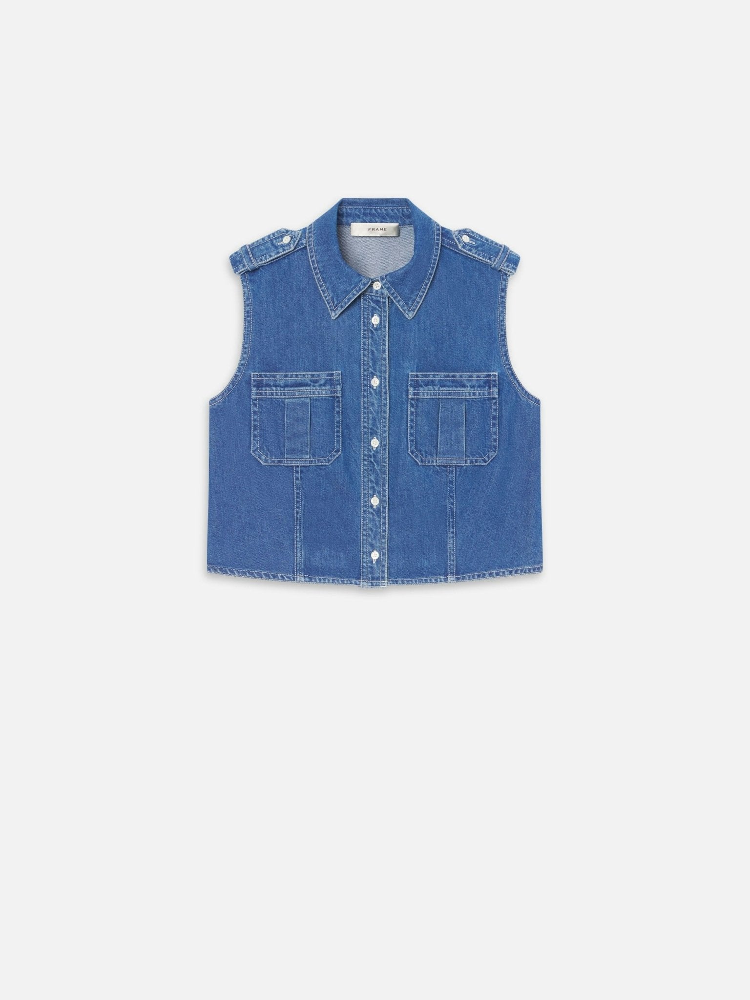 Cut from lightweight low-dip indigo denim for a unique red-blue hue, this cropped shirt features epaulets, utility-style pockets, and a length that hits just at the top of a high-rise waistband. Align it perfectly with the Charm Short for a chic summer suit.