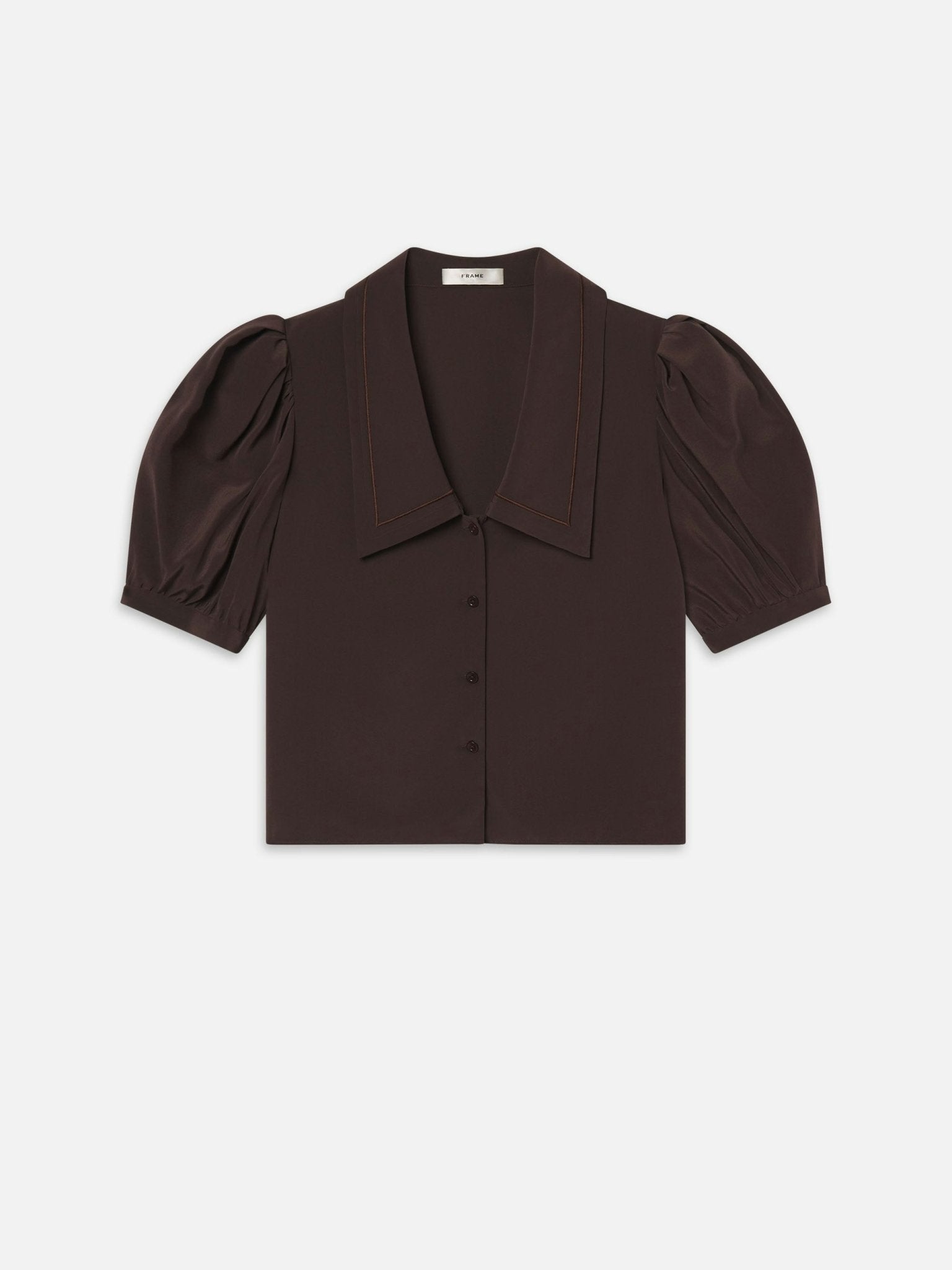 Frame bestselling sailor blouse, now in rich coffee-colored silk. With slightly puffed sleeves for a feminine feel. Soft, elevated, and endlessly wearable.