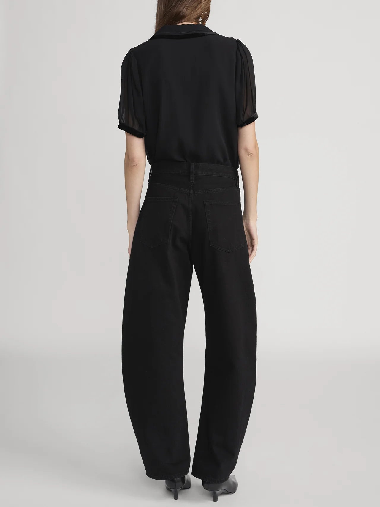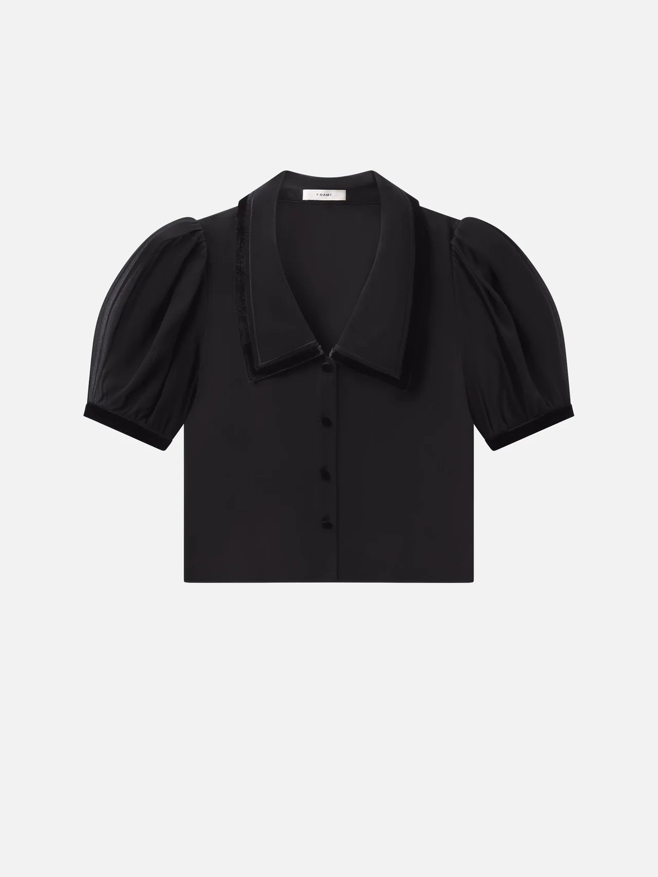 Frame pure silk sailor blouse, elevated with velvet trim at the collar for an unexpected touch of luxury. This feminine silhouette features short, slightly puffed sleeves that add a charming vintage-inspired detail, paired with an oversized collar that commands attention. The rich black hue works effortlessly with everything from tailored trousers to flowing skirts, making it a versatile wardrobe essential. Perfect for elevating casual outfits or adding personality to your professional look. Dry Clean Only. 100% Silk. 21.5" Long From Shoulder.