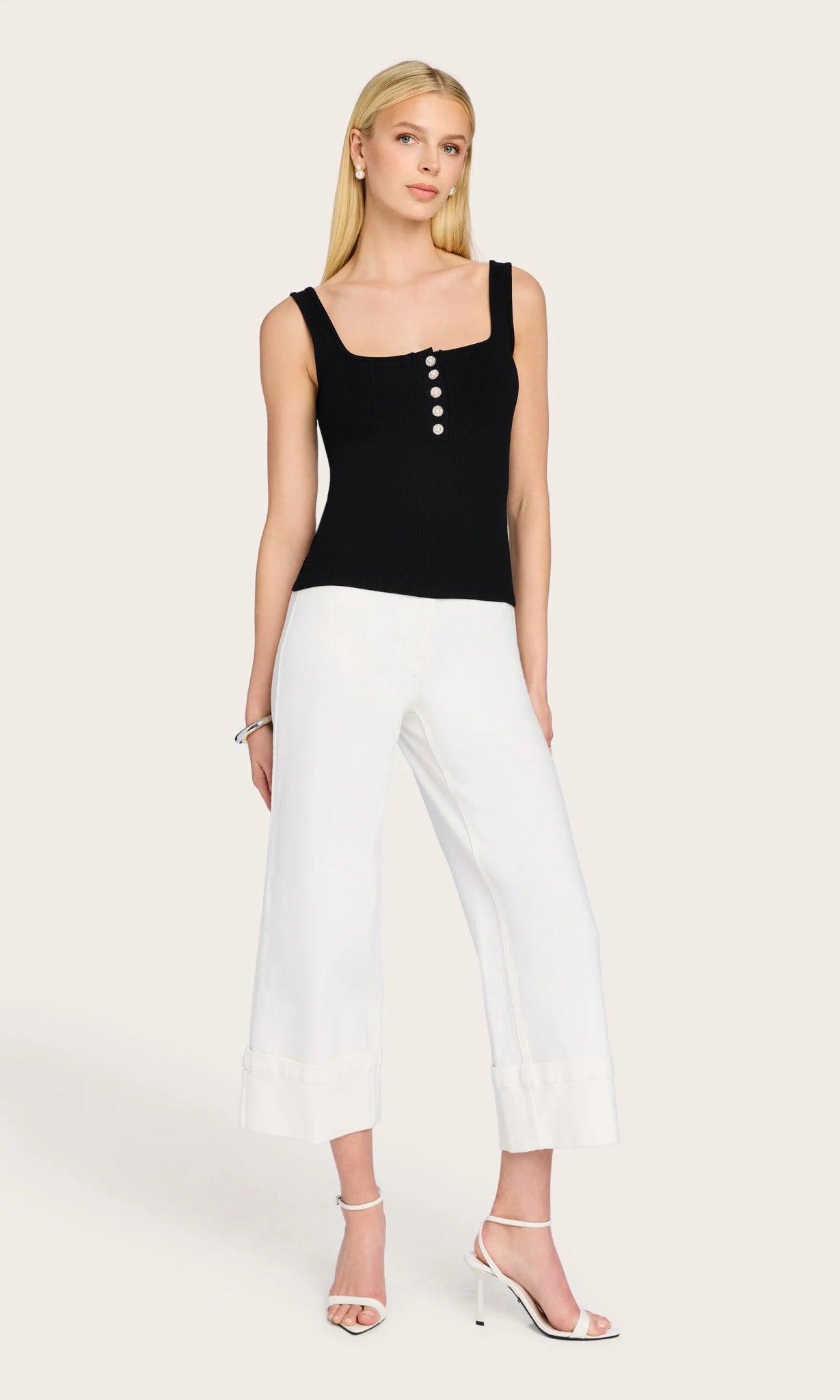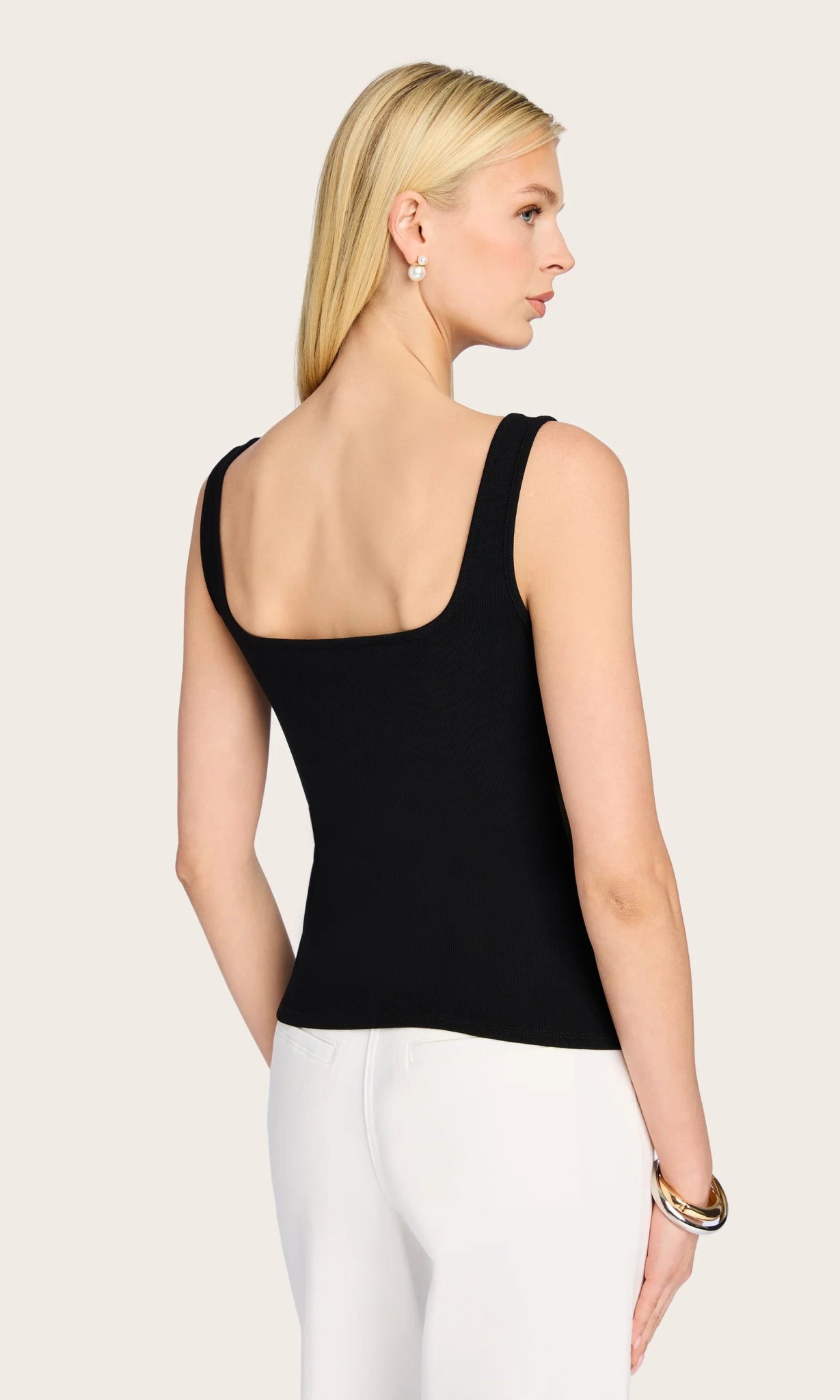 This fine rib jersey tank top features a stylish square neckline and faux pearl buttons. Perfect for warm days, it pairs effortlessly with pants, shorts, or skirts for a casually chic look.