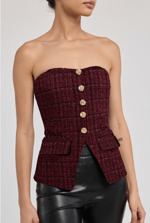 Meet the Quinn—your new power player. This longline bustier top is crafted in luxe lurex tweed and designed with a vest-inspired silhouette, complete with bold gold buttons and oversized flap pockets. Structured yet feminine, it pairs effortlessly with leather pants or a tailored skirt. A statement piece that commands the room.
