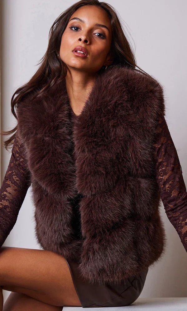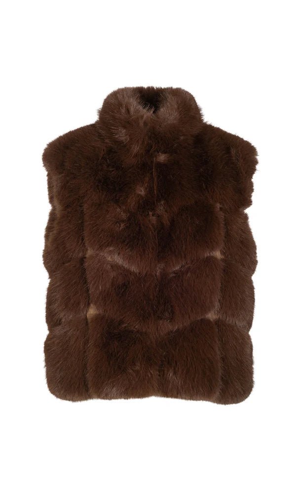 The Rosario Vest is the ultimate in cold-weather glamour. Crafted from plush faux fur in a rich chocolate brown, this high-neck silhouette features chevron paneling for a luxe, dimensional look. Its cropped length adds a modern edge, making it easy to layer over knits, blouses, or leather.
