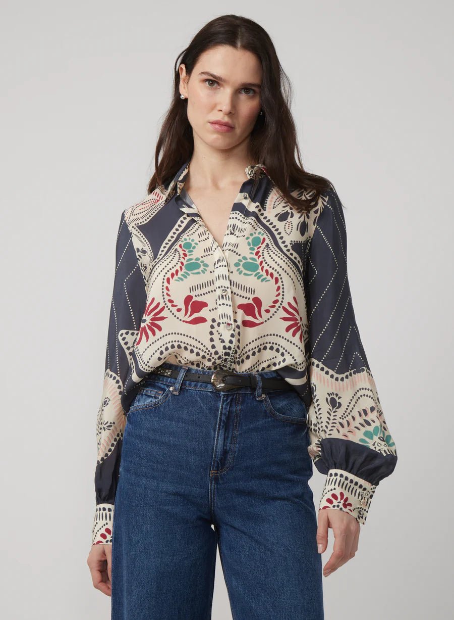 - Button front blouse in a bold printed crepe from Gilner Farrar