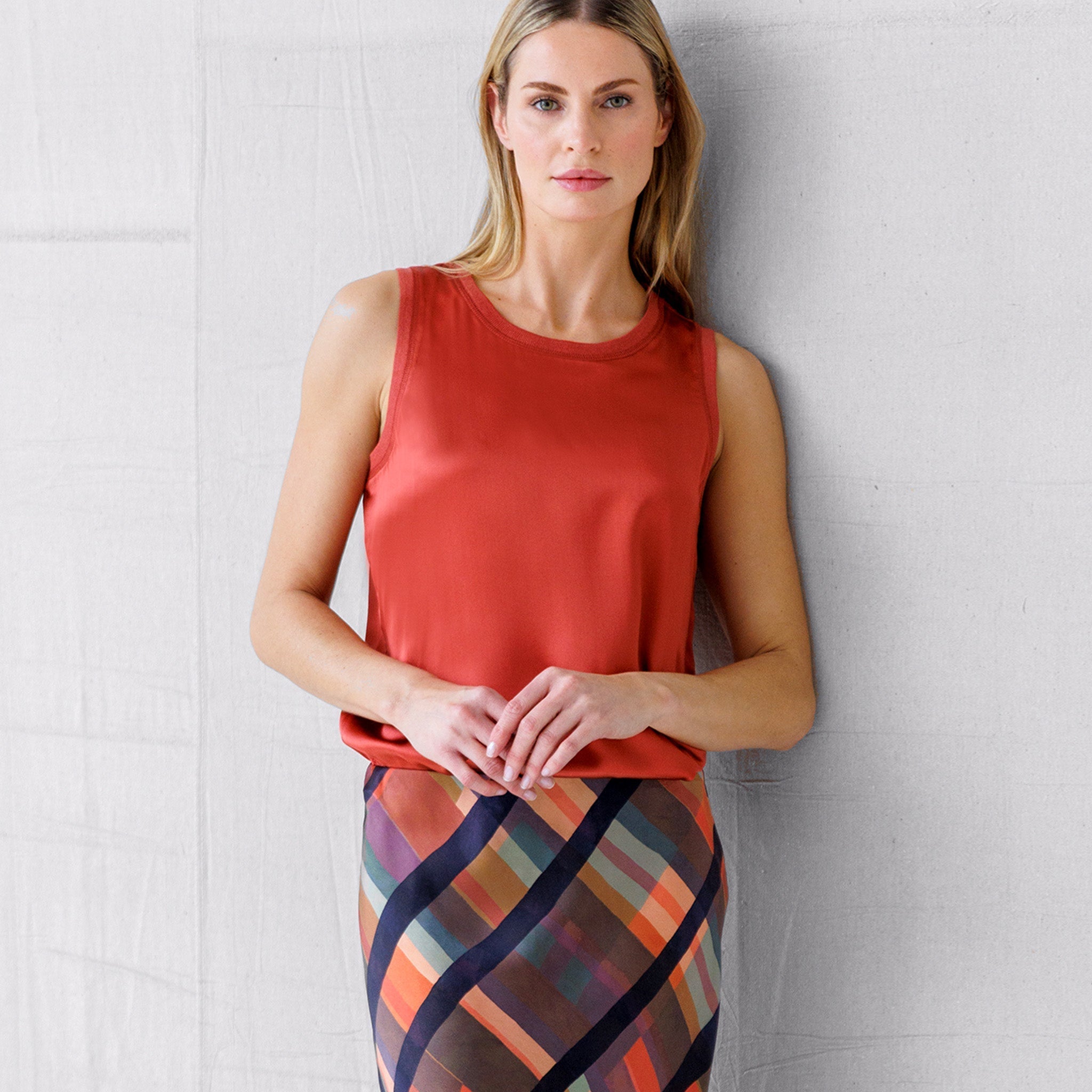 Meet your new endlessly-wearable top. We've juxtoposed rib knit trim and athletic-style stitching against sumptuous silk for a look that is pure luxe-leisure. Swap out your usual knit tank for this beauty and get an instant upgrade to your look. Sold, we'll take one every color.