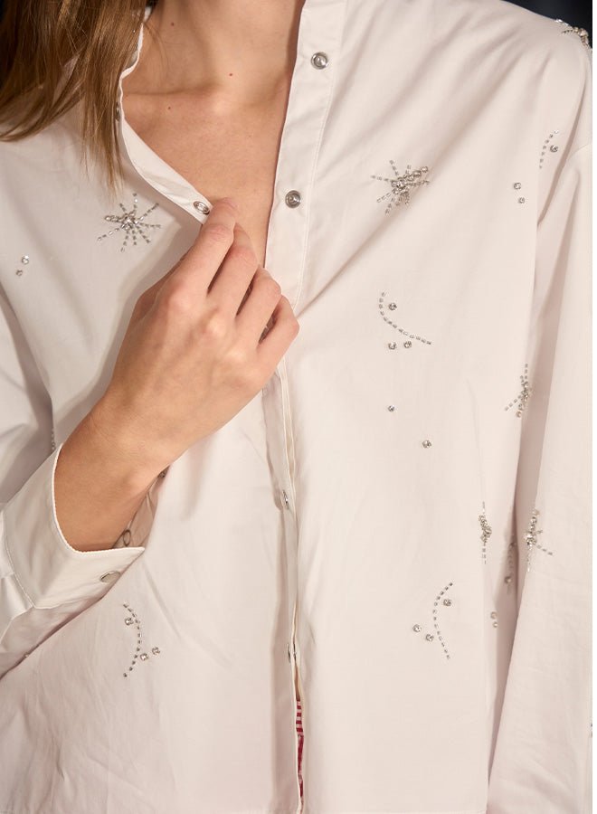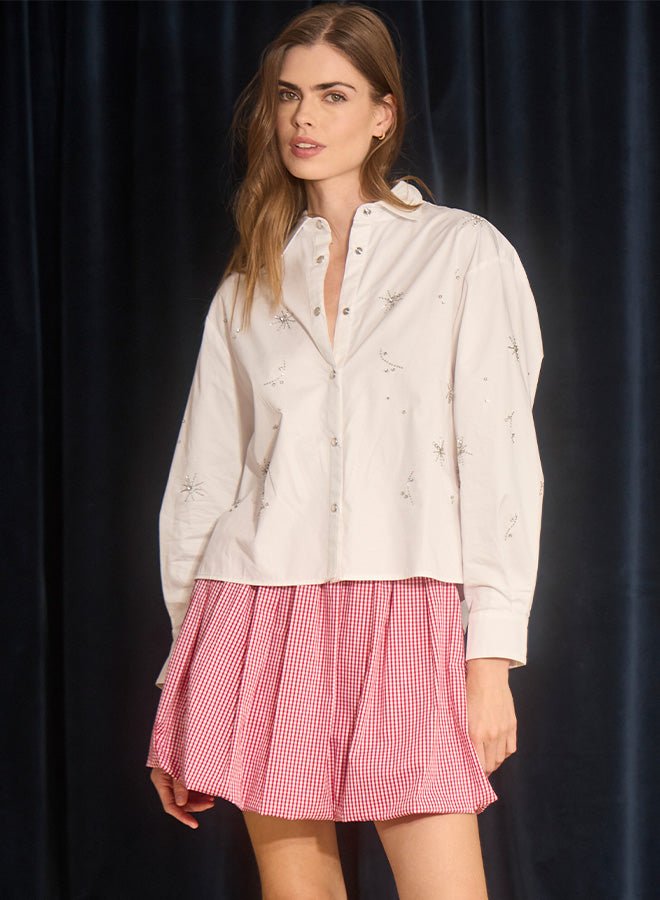 This white Hunter Bell Hudson shirt features a classic collar and button-up front, perfect for layering or wearing solo. With long sleeves that end in buttoned cuffs and crafted from soft, lightweight 100% cotton sateen, it blends comfort with style effortlessly at 23" in length.