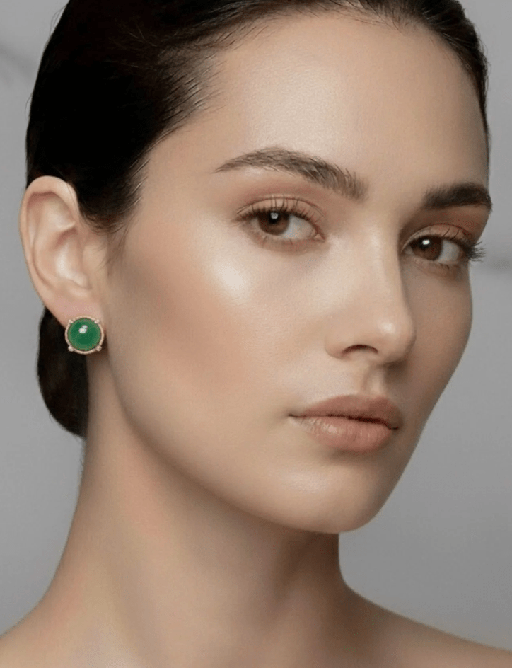 The Odelia Earrings feature a vintage glass jade or angel skin stone beautifully set at the center, surrounded by a textured setting that adds depth and character. Four small bezel-set crystals enhance their delicate elegance, creating a subtle sparkle that complements any look. Comfortable post backs make these earrings an effortless choice for everyday wear, while their timeless design offers a graceful touch to your jewelry collection. Perfect for those who appreciate handcrafted detail and understated sophistication.24K Gold Plate. Hematite Plate. Post Closure. Proudly Made in the U.S.A.
