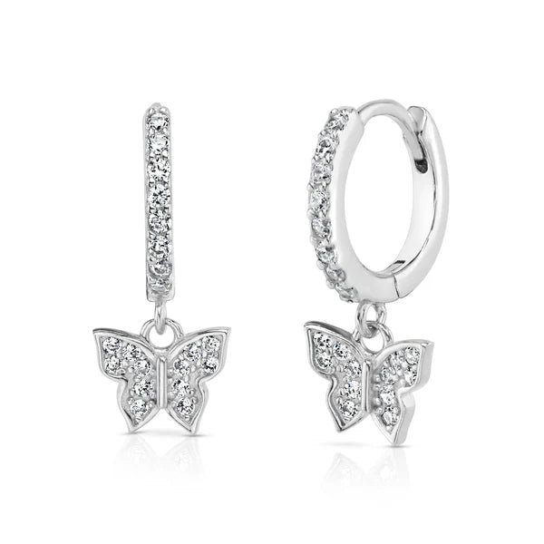 A delicate, hinged cz huggie with a small butterfly charm hanging from the base. The butterfly symbolizes transformation and freedom, adding an elegant yet playful accent to your collection.
