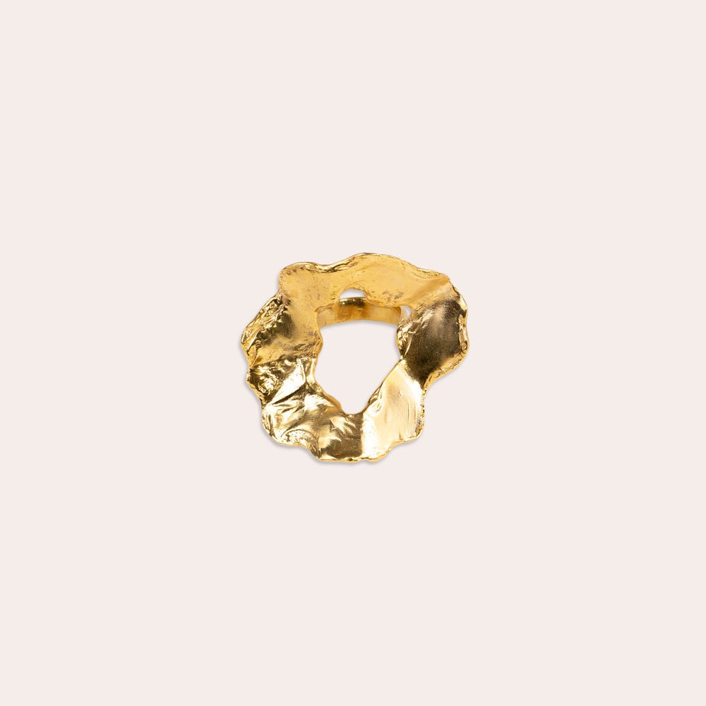 The Melted Pedal ring is made of gold-plated brass with textured edges surrounding an opening in the center. A perfect statement piece for your middle or ring finger. Diameter measures 1.25 inches across.