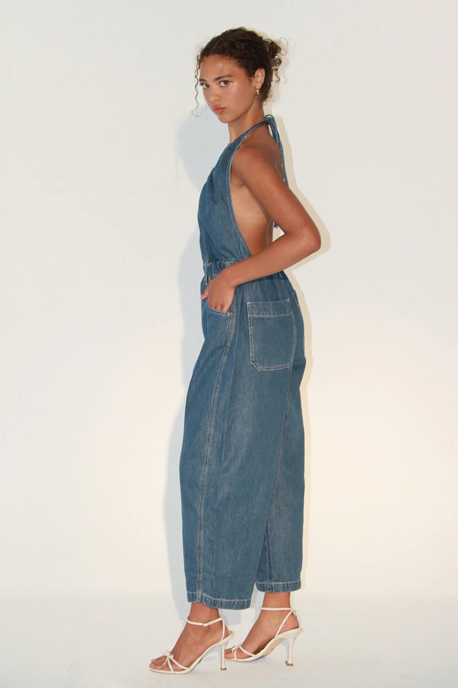 The Laurelle Jumpsuit features a relaxed, tapered leg and a plunging halter neckline with an open back, tied elegantly at the neck. Its cinched waist creates a flattering silhouette.