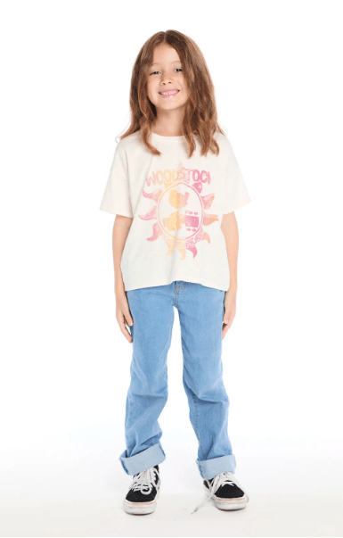 Featuring the iconic Woodstock poster design in warm gradient hues, the soft Starry White fabric completes the style.
