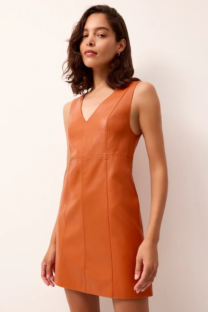 Cut from supple vegan leather, this modern sheath features a plunging V neckline at both front and back, and pickstitch detailing at the seams to add a little edge. Fully lined for comfort, the dress stands on its own for a bold statement, or layers beautifully over knits for a retro-inspired look that nods to ‘70s cool.
