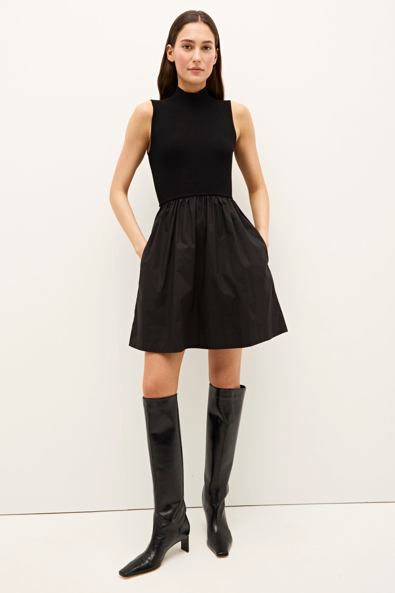 New for the season, our mixed-media Reynolds dress combines comfort and clean lines with a ribbed knit bodice and crisp cotton poplin mini skirt. The easy slip-on silhouette pairs perfectly with boots and a jacket for a polished, fall-ready look.