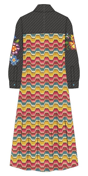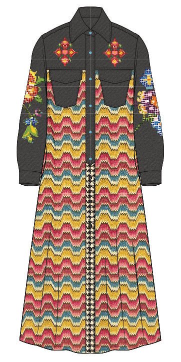 Long sleeved and print button down pleated midi dress. Top of the dress, collar, sleeves and pockets are in denim. The bustline to the hem of the dress features the black denim print.