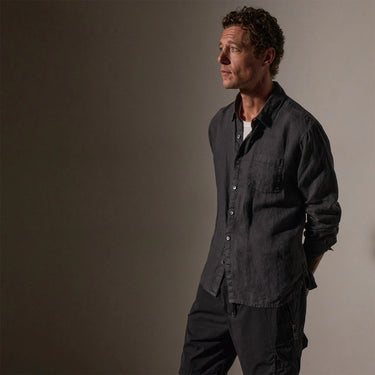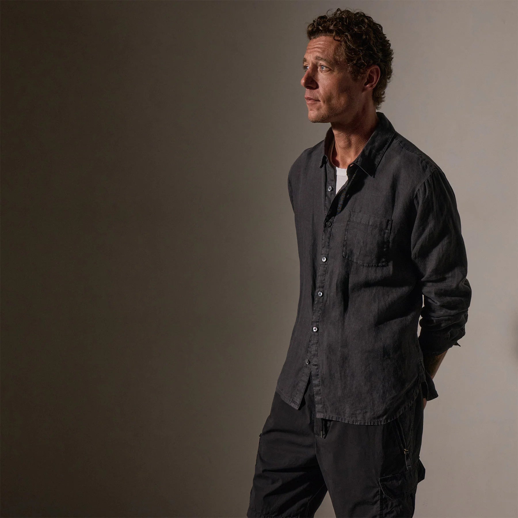 Classic Italian lightweight linen, breathable and soft. Button front closure with front chest pocket. Full length sleeves with placket at cuffs. Back yoke and shirt tail hem.