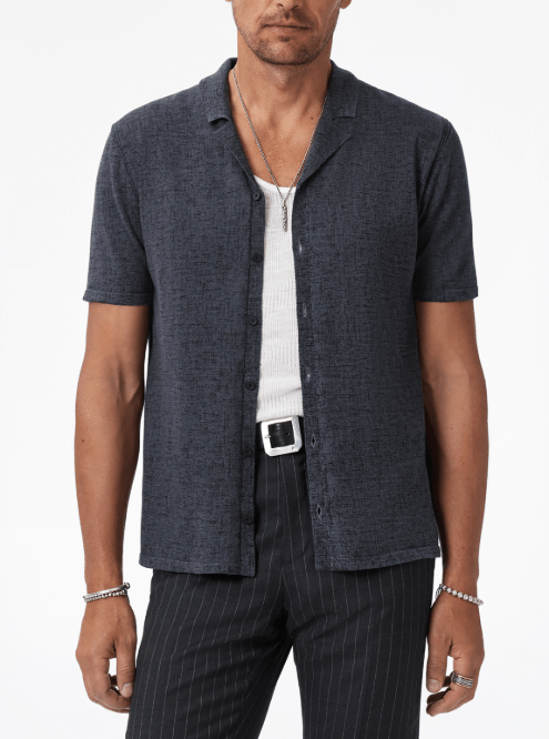 Step into effortless cool with the John Varvatos Nayeem Etching Printed Camp Collar Shirt in Charcoal Heather. Its relaxed camp collar and unique etching print add a touch of artistic edge, while the charcoal heather shade keeps things versatile. Perfect for days when you want to look sharp without trying too hard.