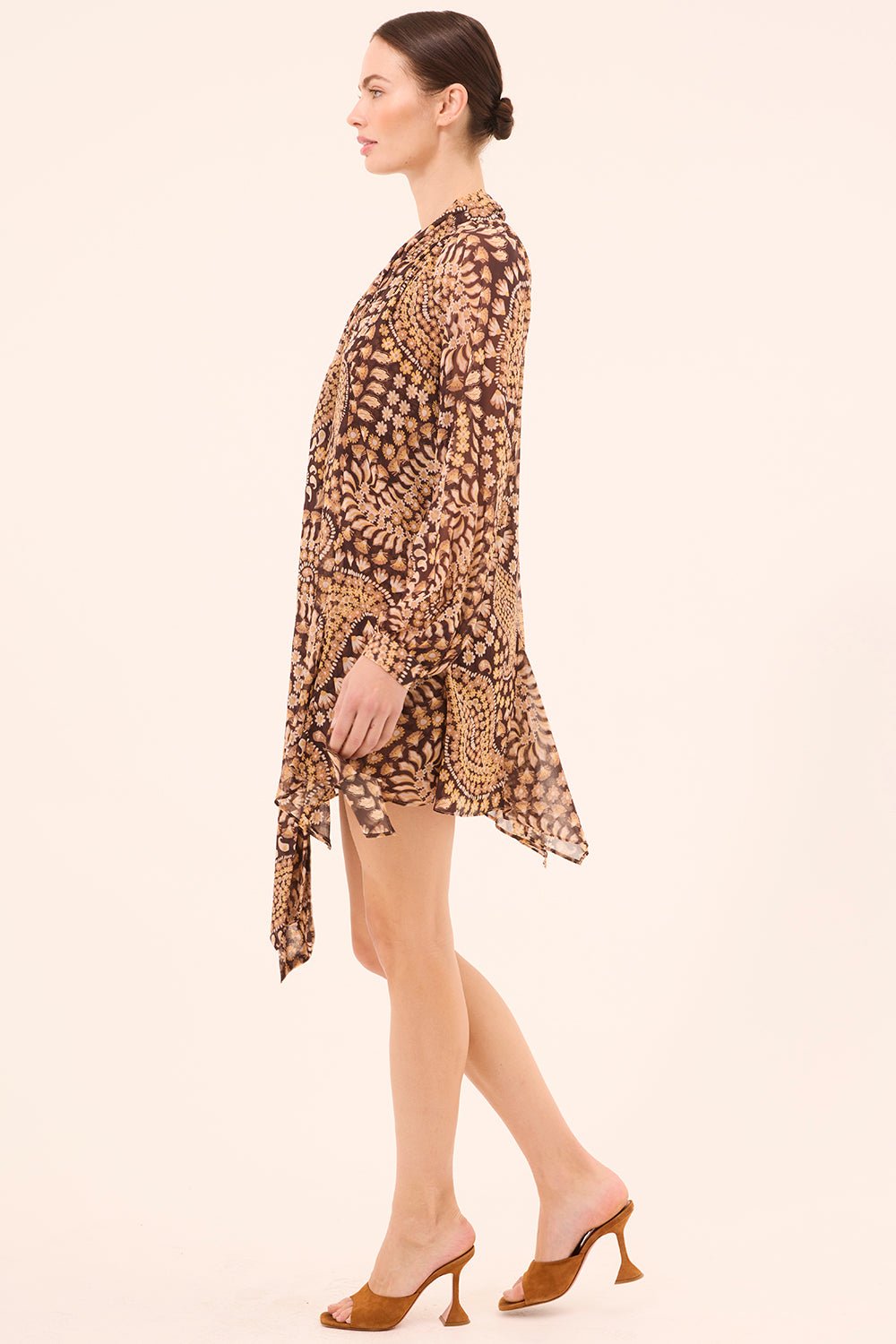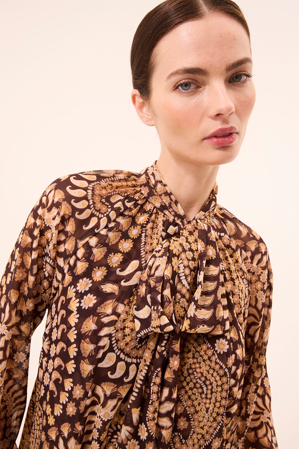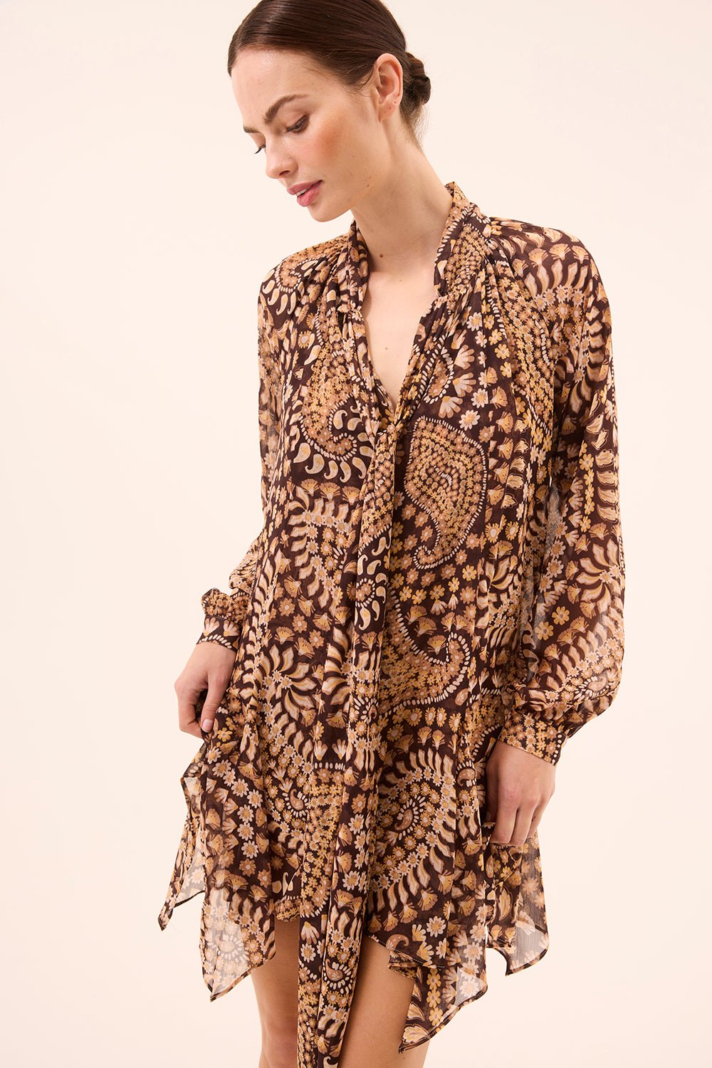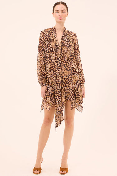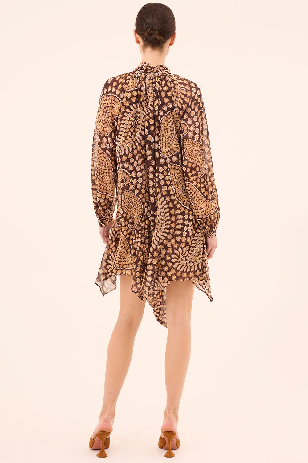 The Cindy Dress is a mini-length silhouette cut from our Daisy Paisley printed crinkle chiffon. The relaxed, double-lined body is complemented by sheer blouson sleeves with button cuffs. A high neckline features a versatile tie detail that can be styled at the front or back. Finished with a playful handkerchief hem for added movement.