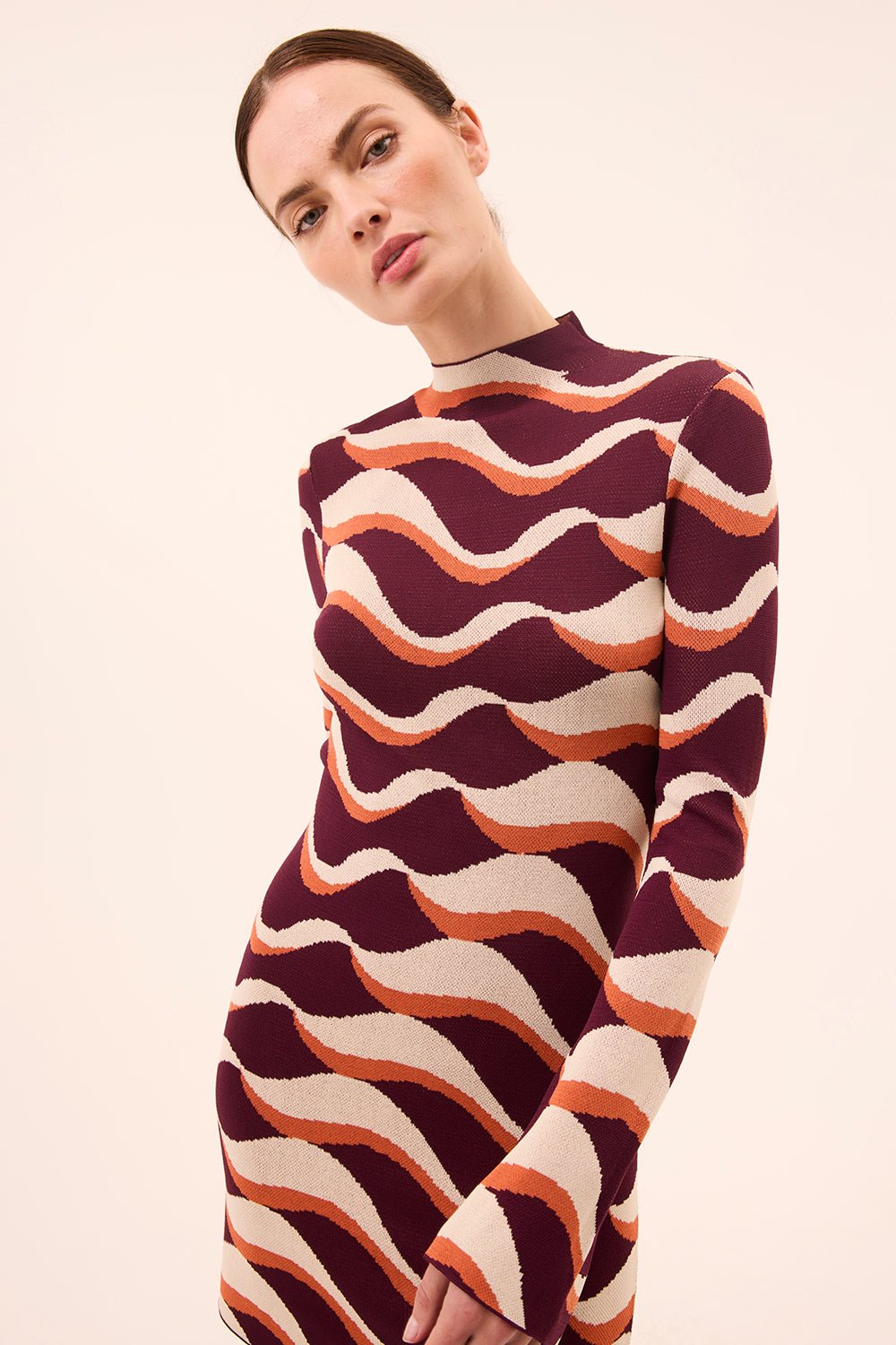 Make a statement this season with the Deliz mini dress, crafted in a striking Autumnal Wave stretch jacquard knit. This figure-hugging silhouette features a mock turtleneck with a double button closure at the back and long sleeves with a subtle flare. Effortlessly versatile—pair it with knee-high boots for cool-weather chic or dress it up with strappy heels for an elevated evening look.
