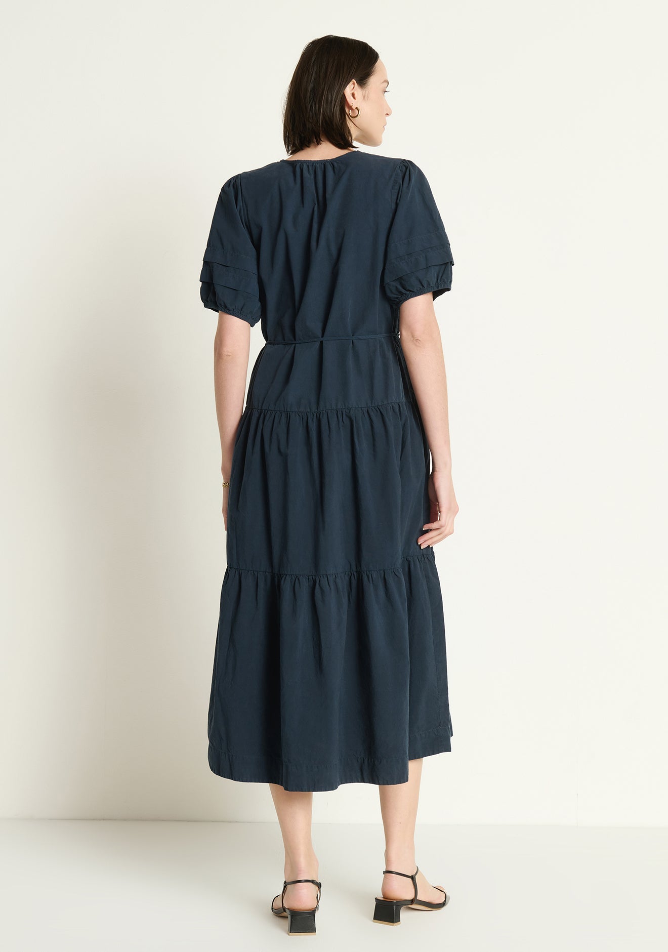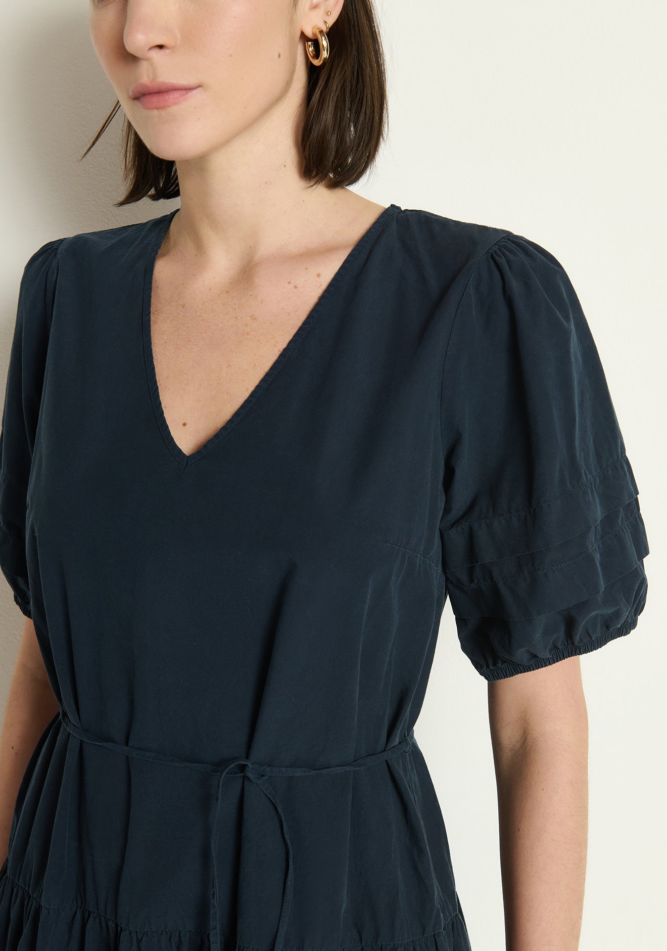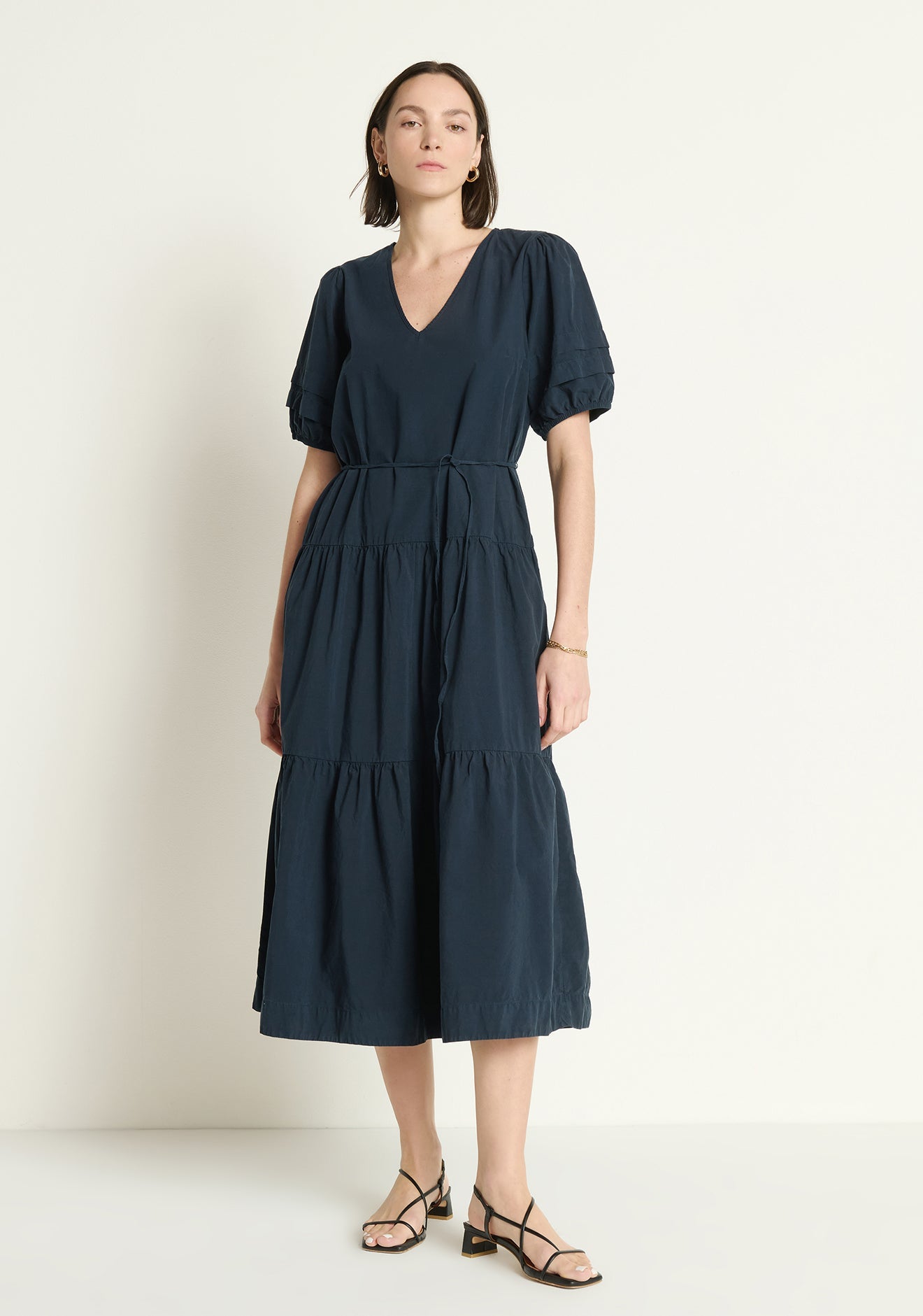 This timeless midi dress was designed with a flowy, tiered skirt, a cinchable waist tie, and a flattering V neck. Pairs beautifully with everything from sneakers to strappy heels. This one comes in Navy Night Sky.