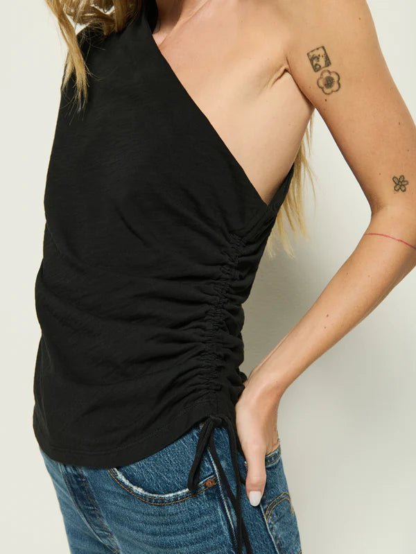 A flirty, yet sophisticated, cotton tee to dress up or down, the Jaylen Asymmetrical Tee features single-shoulder coverage with gathered tie detailing at the hem for a beautifully tailored design. This one comes in Jet Black.