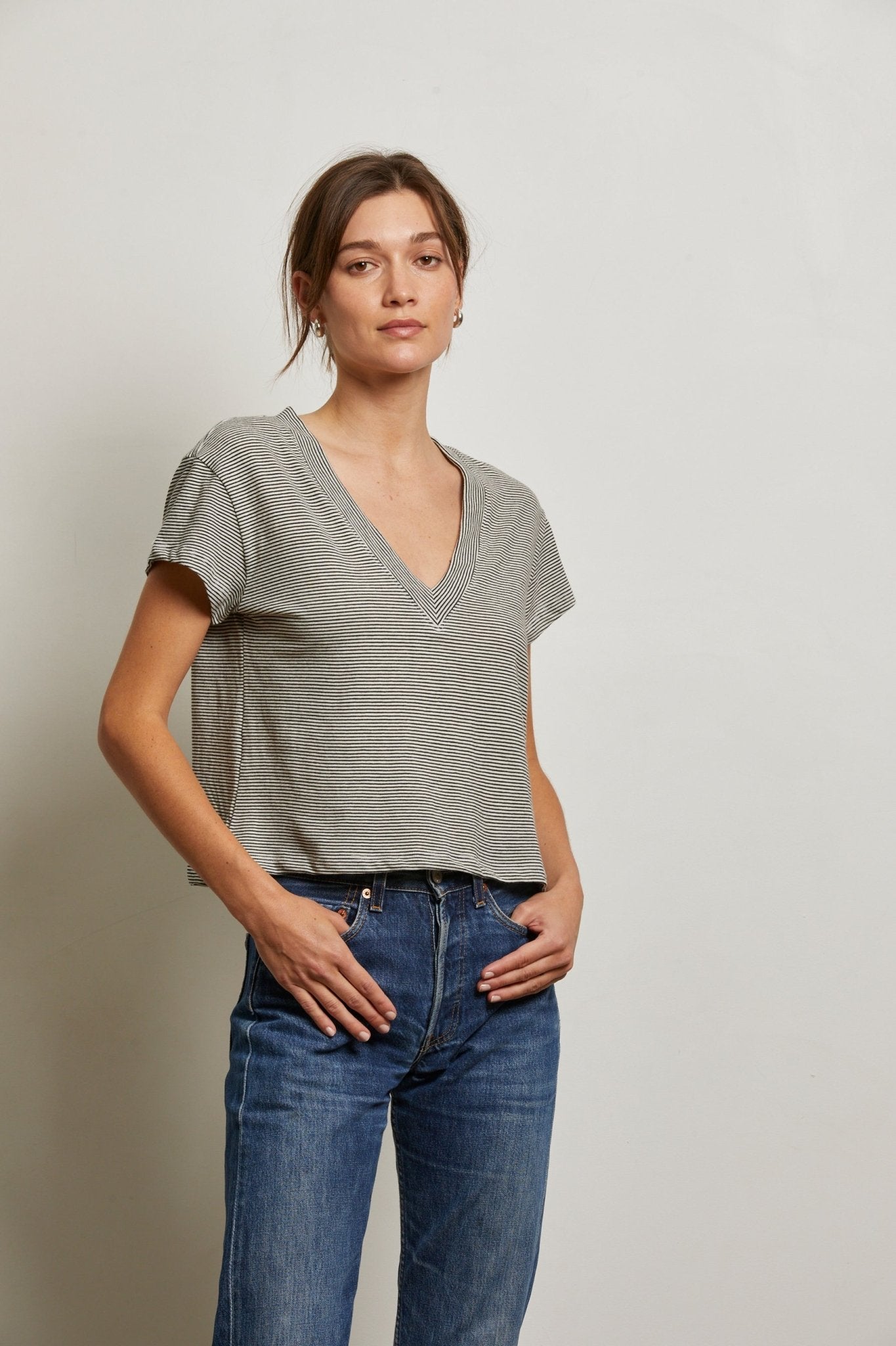 Perfect White Tee Rosie V Neck in Ivory Black Stripe