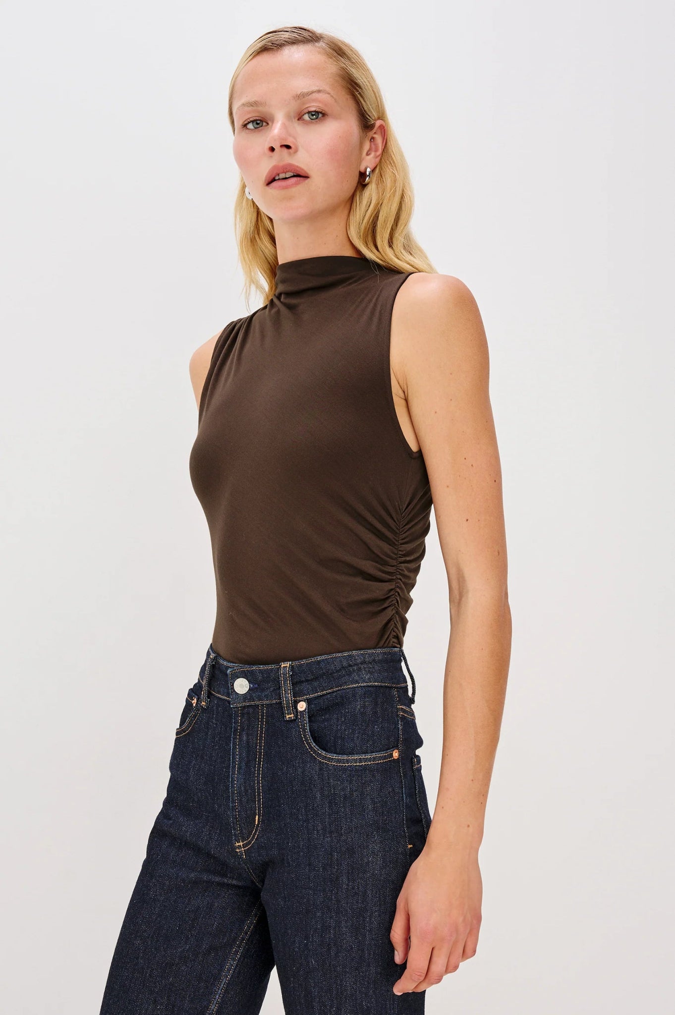 The Christen is a sleeveless top crafted in lightweight tissue jersey. It features a funnel neckline and ruching details for an ultra-flattering fit.