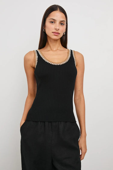 The Estrella elevates the classic black cami with a ribbed cotton fabrication and dual-tone crochet trim. This style has a fitted, body-contouring silhouette and a scoop neckline.