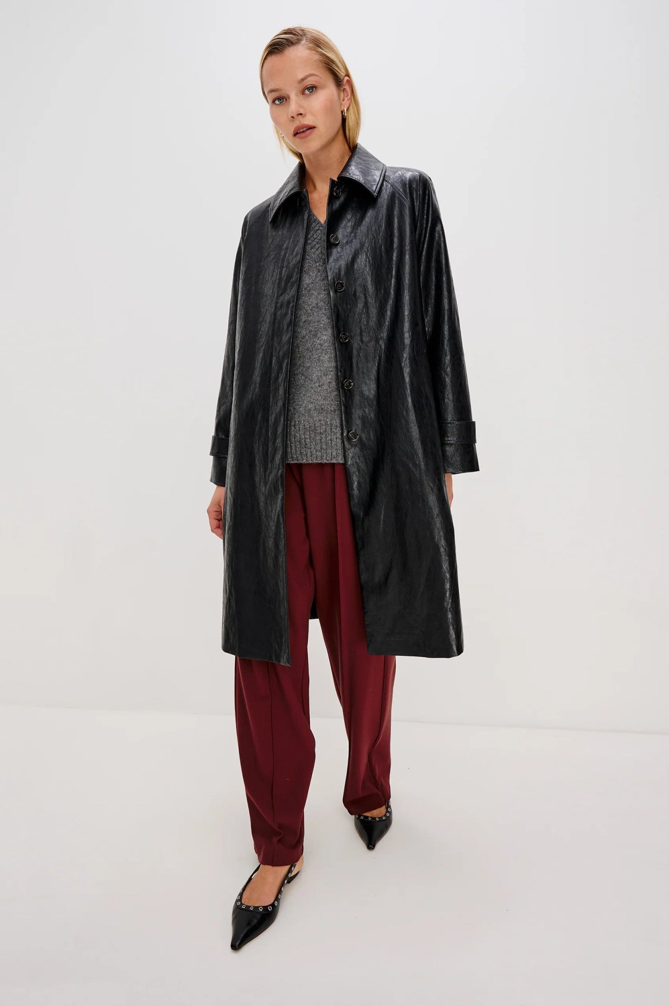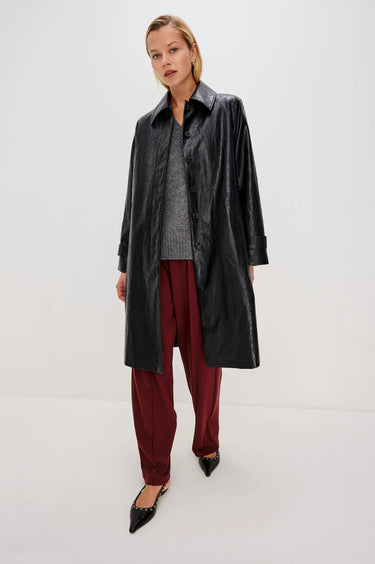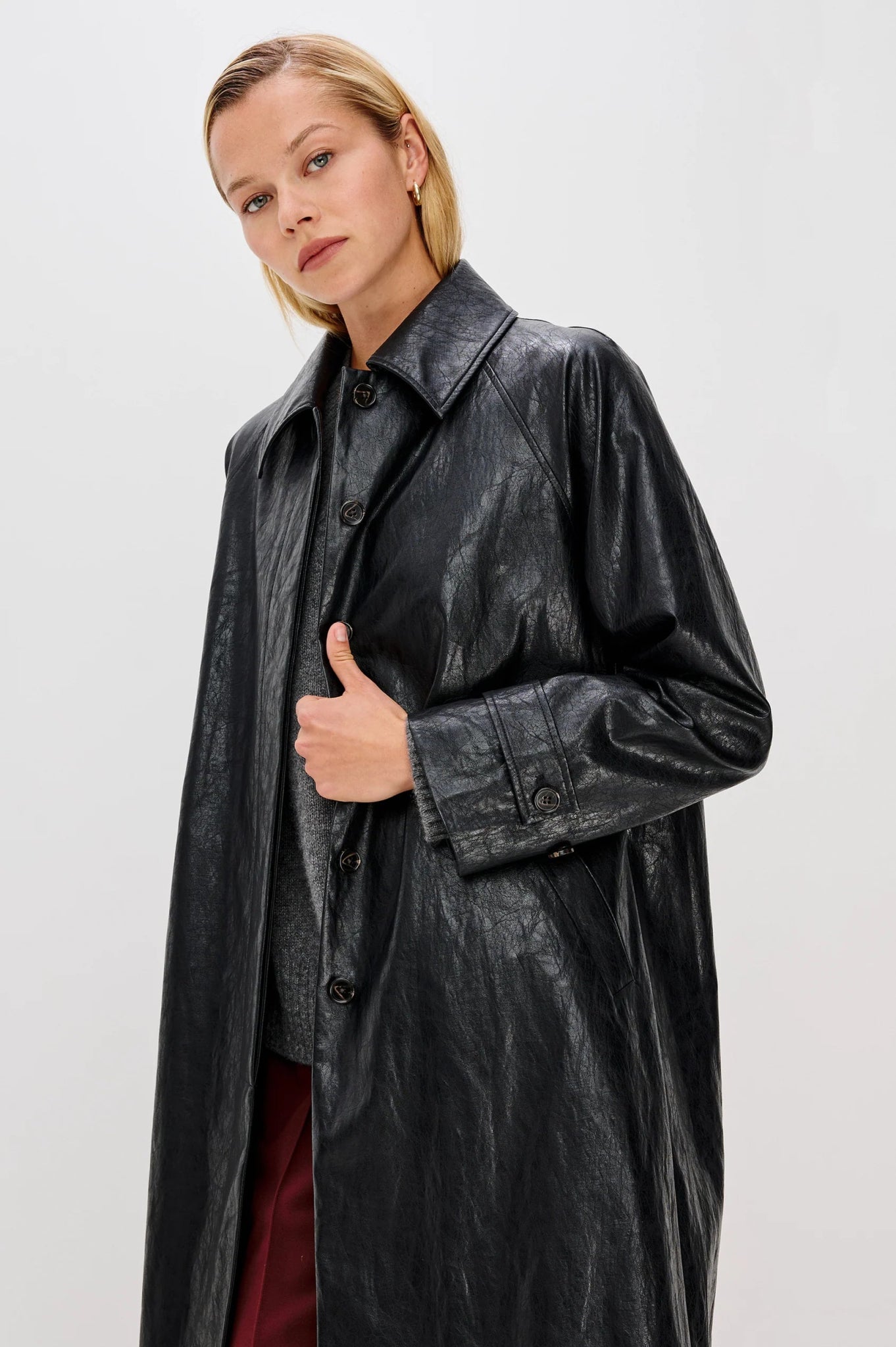 Inspired by the classic trench, the Hills is a water-resistant faux patent leather coat with a hidden placket and sleeve tab accents. A slightly oversized fit keeps the silhouette streamlined while offering standout style in any weather.