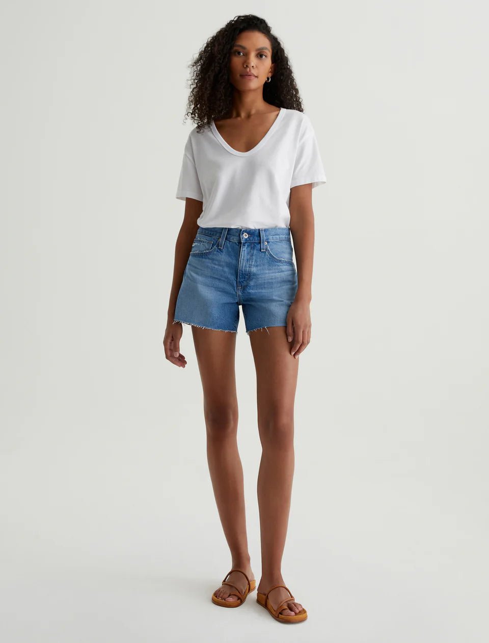 FINAL SALE. The Halle high-rise cutoff shorts have a relaxed, easy fit through the hips. Cut from 12 oz. Drapey Rigid Denim, these five-pocket women's shorts come in a brilliant blue wash with soft fading and raw hems.