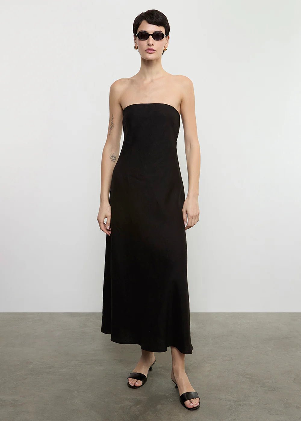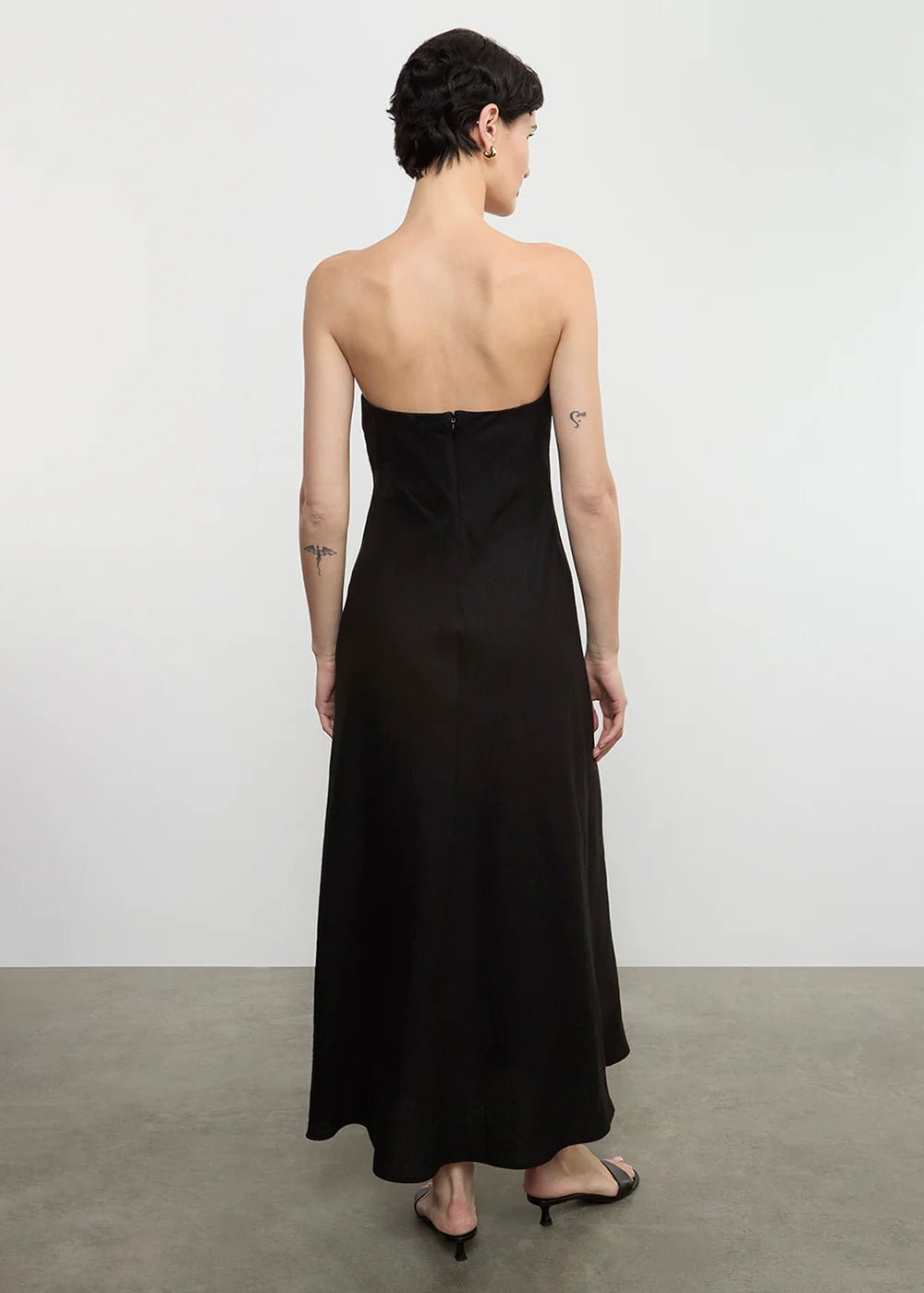 FINAL SALE. Crafted from 100% linen, the Linen Bias Dress features a strapless neckline with a lined bralette, maxi length, and a concealed back zipper.