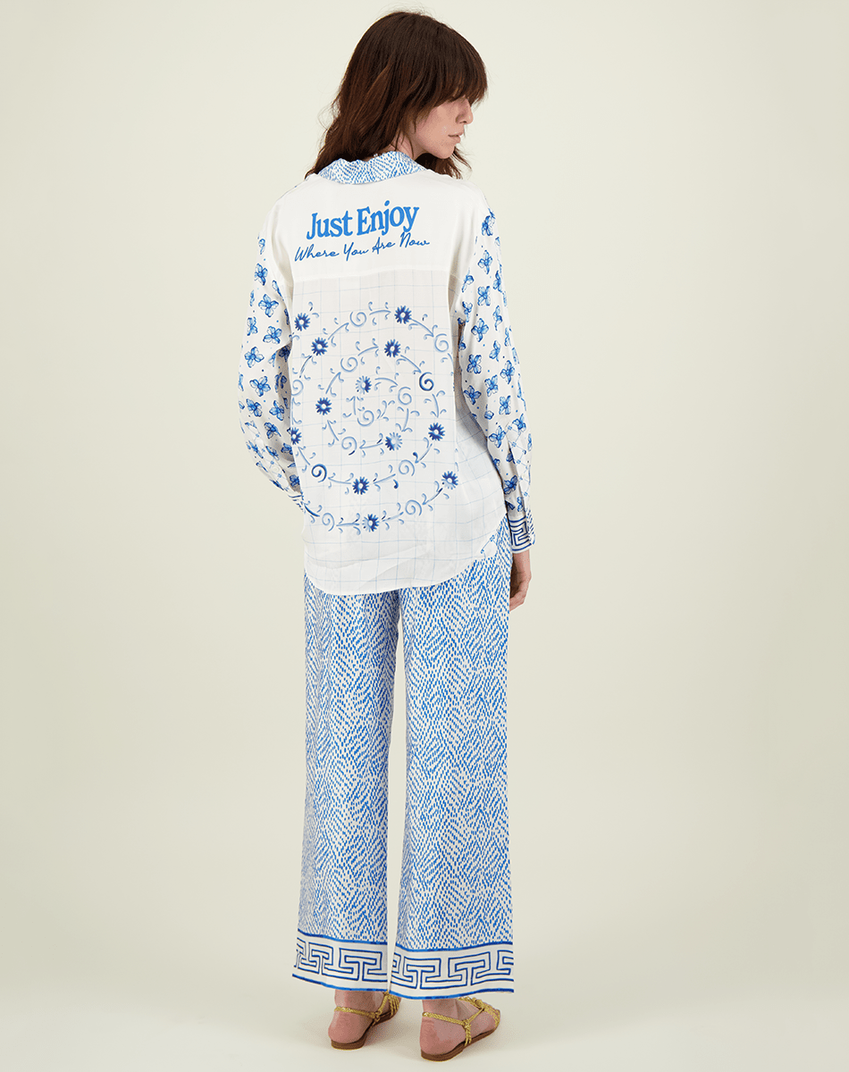 FINAL SALE Classic long sleeve collared shirt in mixed geometric print in shades of blue. Button down with a breast pocket. Front of the shirt features a stylized dragon in an ornate frame. The back reads “Just Enjoy Where You Are Now”. Body of the back has a large circular geometric pattern. Perfect with jeans or our casual pants for a sophisticated flattering look.