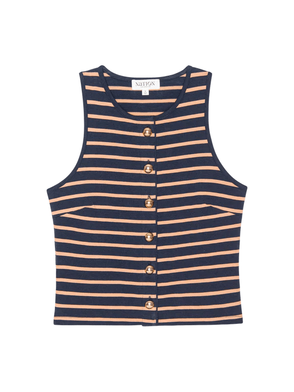 This versatile tank features a crew neckline and functional placket with our signature gold buttons imported from Italy. Do it all the way up for a polished look, or leave it partially open for a perfectly undone vibe. This one comes in Latte Stripe.