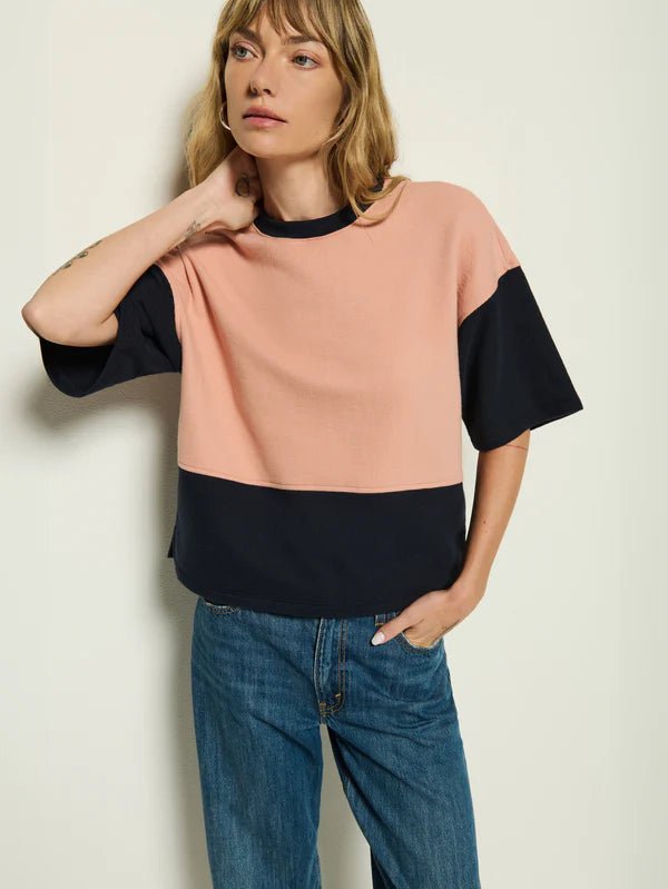 FINAL SALE. The Barrett Sweatshirt is your effortless essential to throw on and go. With a color blocked fabric, this Pima Cotton design features a boxy cropped silhouette with slits at the hips for extra ease and movement. This one comes in Navy Night Sky Color Block.