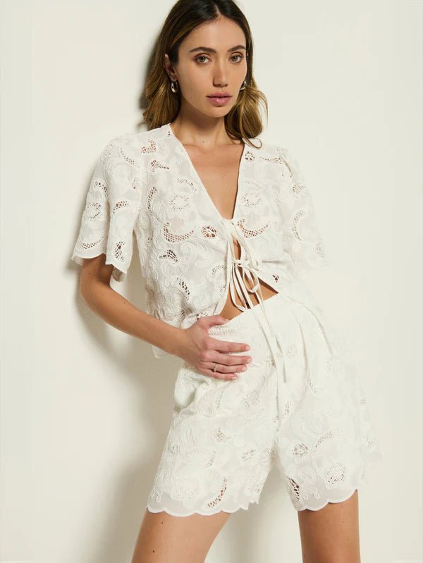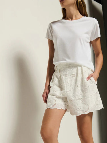 Your warm weather short with a feminine update-the Archer Short features a lined lace mid-rise design, front hand pockets, elastic waistband, scalloped hem, and pleated detailing for a relaxed, yet polished look.