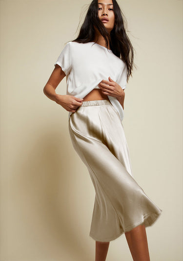 This raw hem, midi length skirt in Hammered Satin is cut on the bias which means a perfect slim fit that hugs all the right places. Elastic waist.