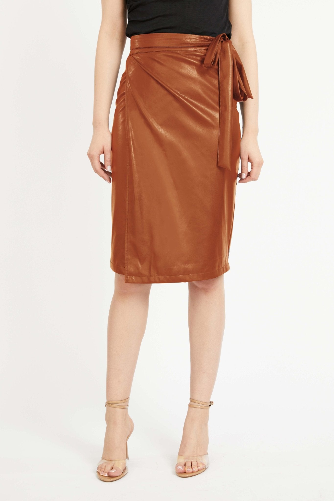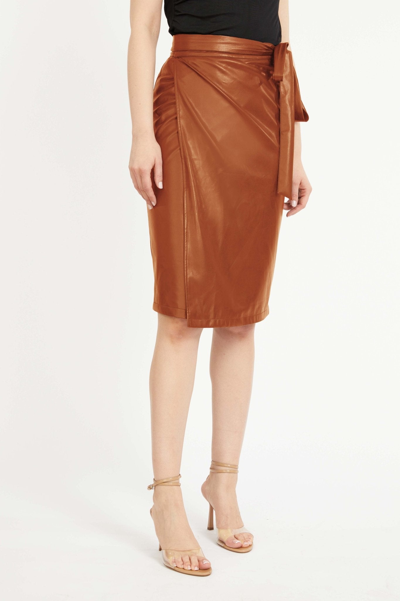 Introducing the Peyton Skirt, a knee-length wrap skirt crafted from sleek vegan leather in our rich Tobacco hue. Designed with a flattering pencil silhouette, it features adjustable side ties for a customizable fit.