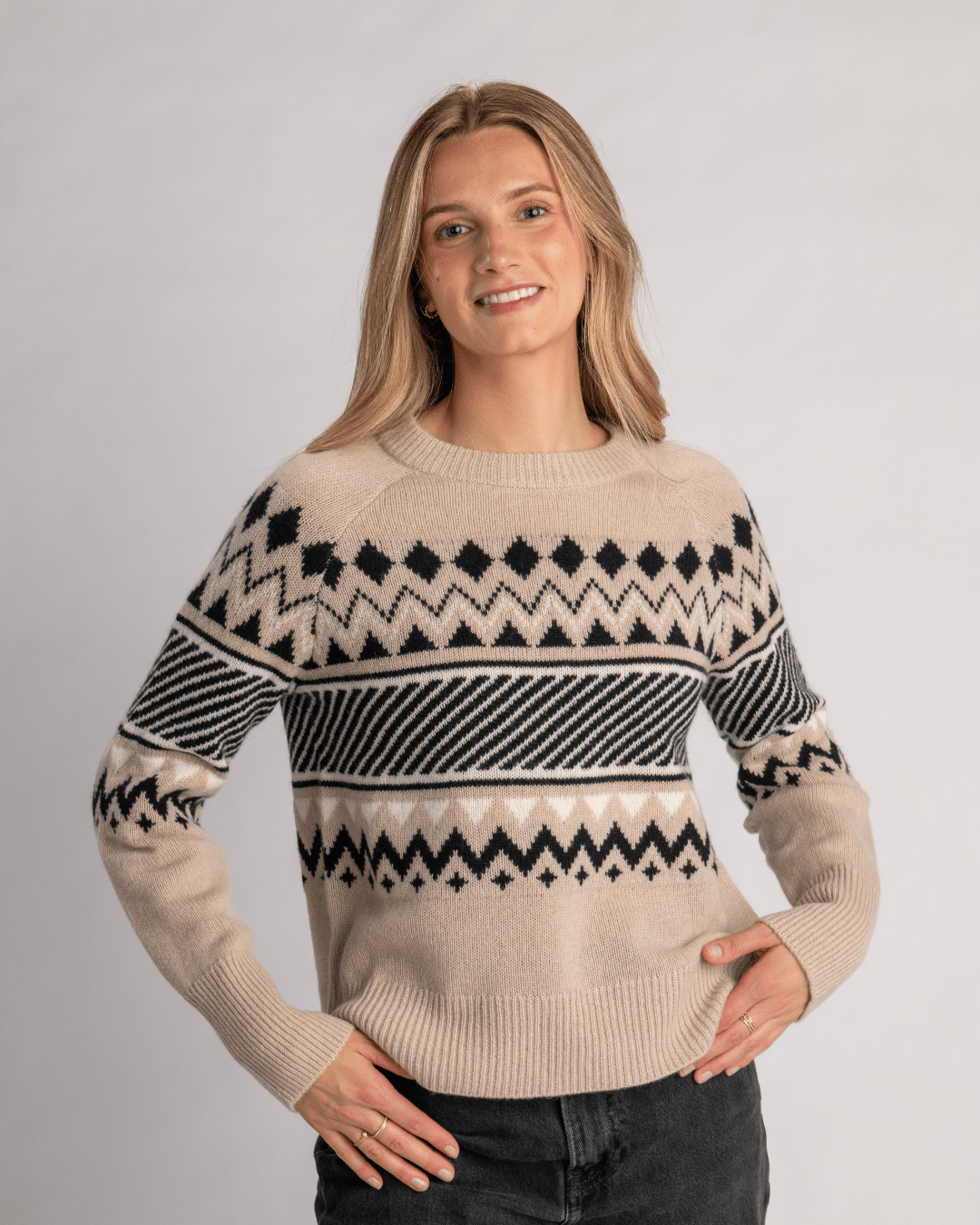 Archer Cashmere Kai Intarsia Crew in Oatmeal Black Ecru