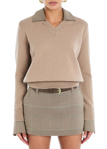 V-neck, knit sweater. Removable cuffs and collar. Shown here in Desert.