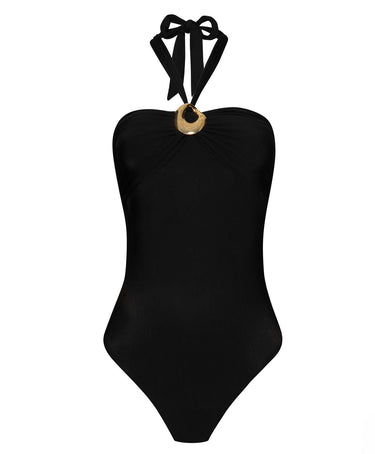 The Eliza One Piece is the definition of timeless elegance. Designed in classic black, this sophisticated silhouette features a chic halter neckline with adjustable ties for your perfect fit. A touch of 24k gold-dipped hardware adds just the right amount of glamour, while the figure-hugging design smooths and flatters in all the right places. Effortless, refined, and endlessly flattering — Eliza is made for poolside moments and seaside escapes alike.