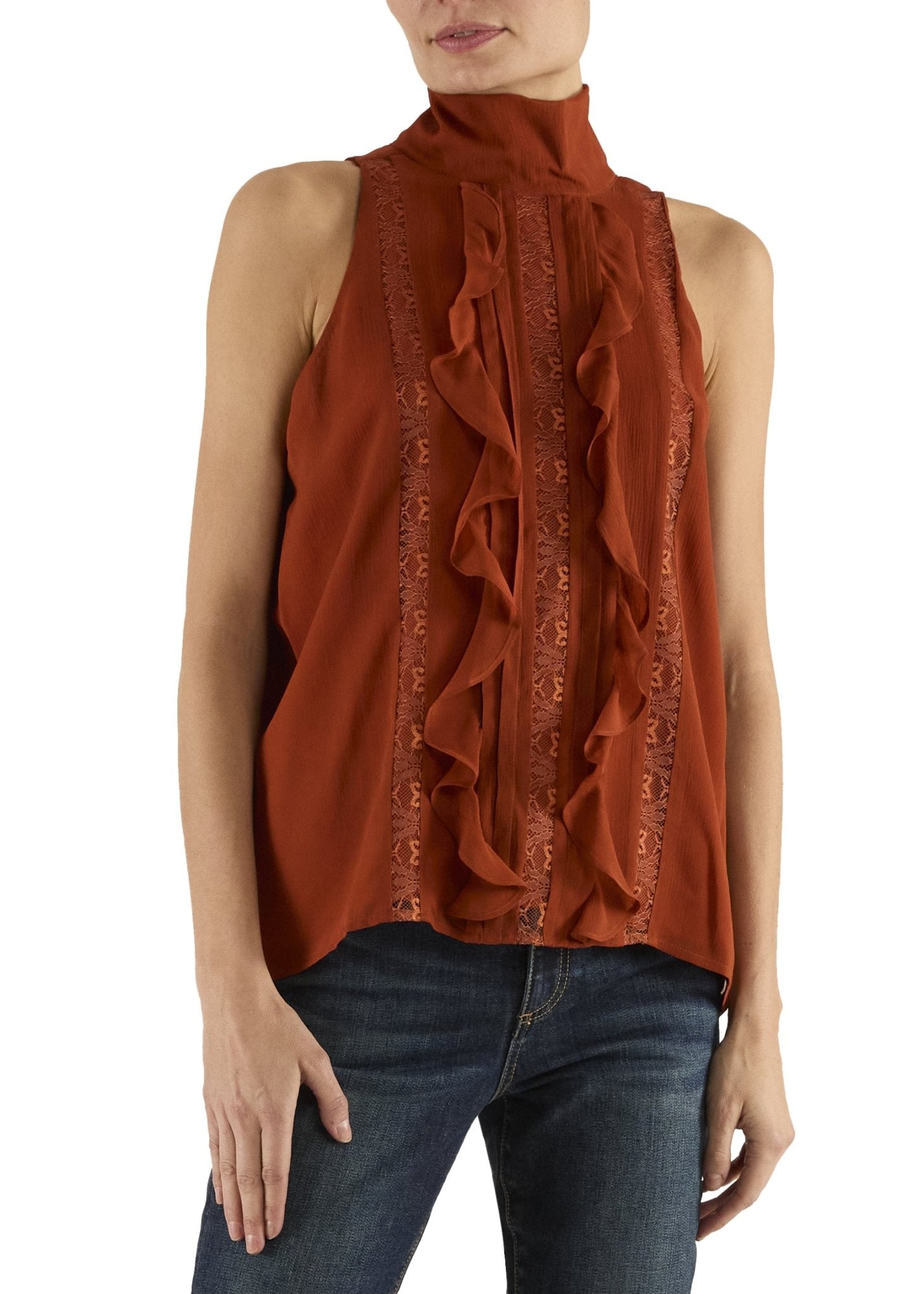 Romance lives in the details with the Christine, where vertical lace panels and ruffle accents create feminine intrigue in a sleeveless mock neck. This relaxed silhouette feels effortless while looking intentional, ideal for brunch dates and garden parties where subtle elegance wins.